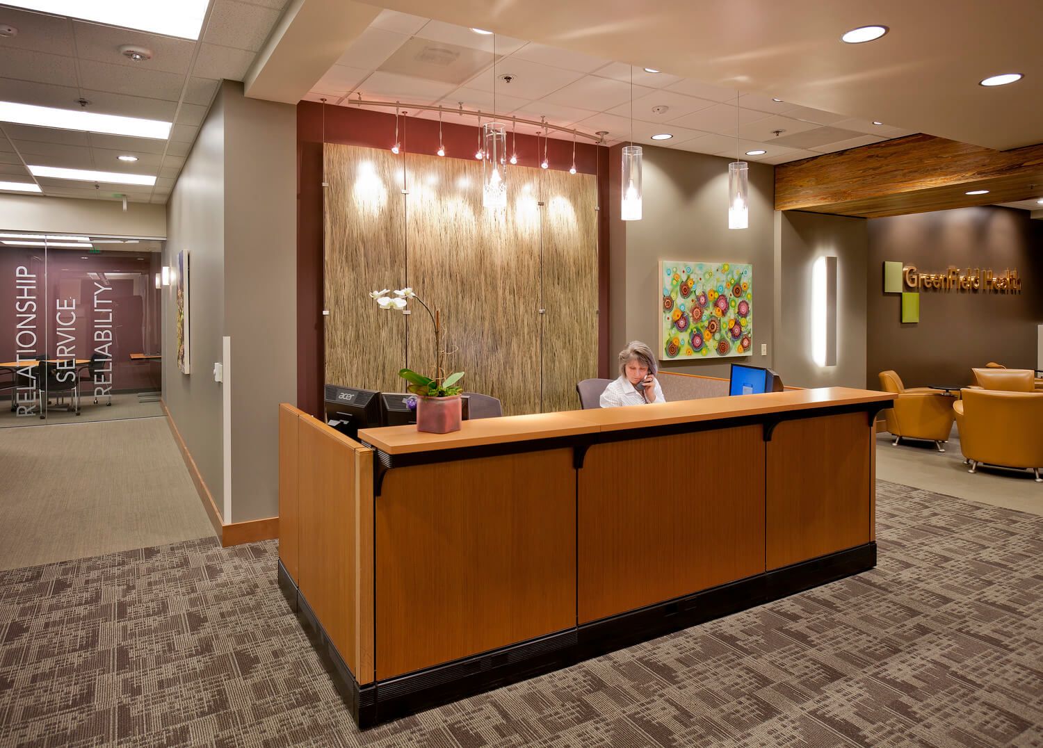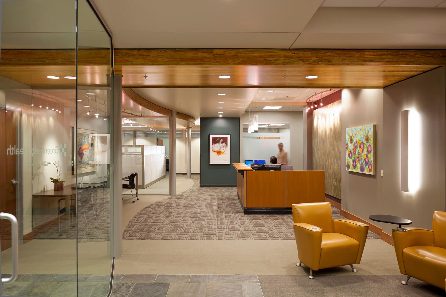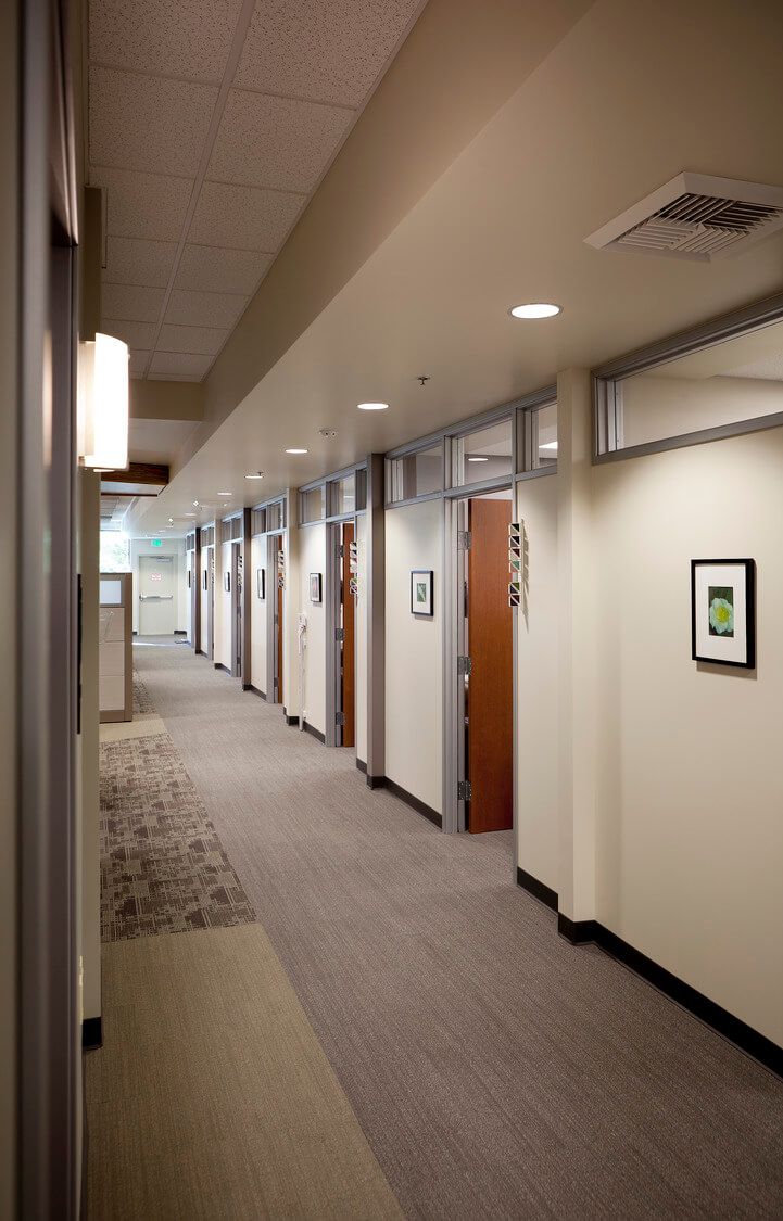 This patient-centered design improved the user experience while supporting clinical functions. High ceilings, wide hallways, glazed partitions, and clerestory windows extend daylight through the space. Acoustical ceiling clouds temper noise in the open office, while "meet-and-greet" rooms provide enclosed retreats for sensitive conversations.